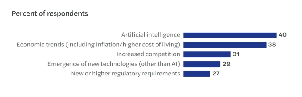 Die Begeisterung hält sich jedoch in Grenzen. Ökonomische Gegenwinde, von Inflation bis hin zu steigenden Lebenshaltungskosten, bleiben für viele Führungskräfte zentral, ebenso der zunehmende Wettbewerb und das Aufkommen weiterer neuer Technologien. Das Bild ist klar: KI dominiert zwar die Diskussion, doch sie ist Teil einer umfassenderen Transformationsagenda, die Geschäftsmodelle und die Menschen, die für den Erfolg entscheidend sind, grundlegend verändert.