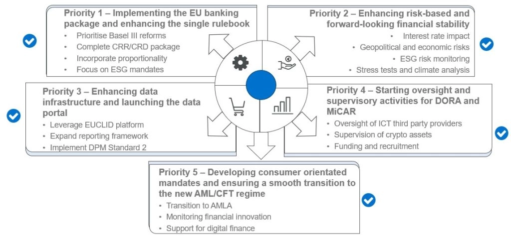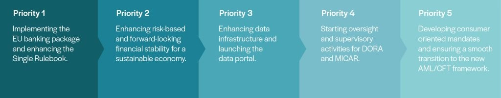 Additionally, the EBA will take on new responsibilities, including overseeing ICT third-party service providers and supervising issuers of significant asset-referenced and e-money tokens. With various evolving risks on the horizon, the following five strategic priorities have been set for 2025: