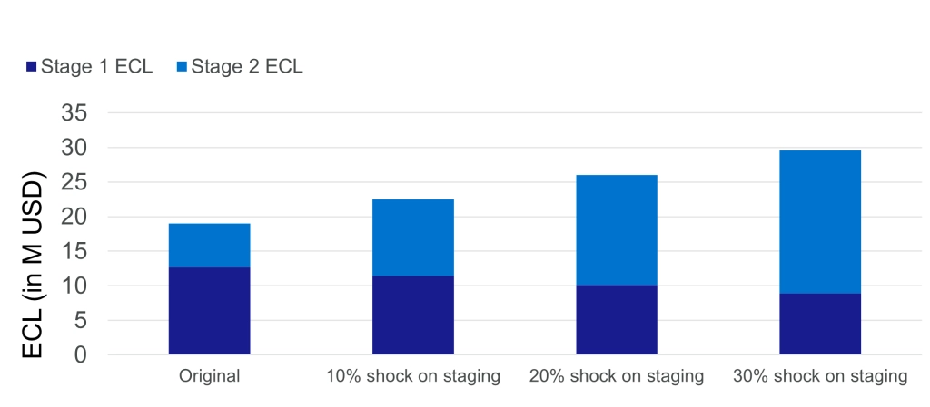 Our simulations show that even moderate staging shocks can lead to material increases in credit provisions. When just 10% of Stage 1 exposures are moved to Stage 2, total ECL rises by approximately 18%. At the 30% shock level, the increase reaches nearly 56%, with the Stage 2 provisions more than tripling compared to the original baseline. This disproportionate impact highlights the non-linear nature of staging effects: Stage 2 exposures require lifetime ECL, whereas Stage 1 exposures are limited to 12-month losses.