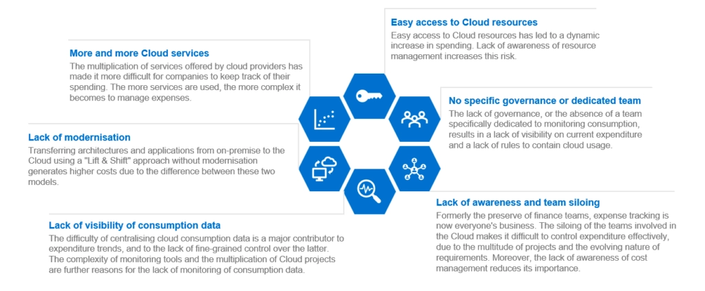 Without FinOps, current and future Cloud management is likely to be laborious (lack of understanding of invoices and their component, lack of visibility of resources on the Cloud infrastructure, automatic scaling of resources without spending controls, etc.), preventing companies from achieving their objectives and even causing investment budgets to burst.