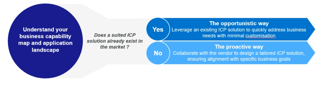 - The opportunistic way: understand your strengths and weaknesses starting from a Business Capability Map, creating a link between business strategy and underlying applications and technologies. Identify the areas that need investment and explore the ICP market to identify solutions that may help solve business challenges. Companies taking this approach may need to consider the proactive way if no ICP solution suits.